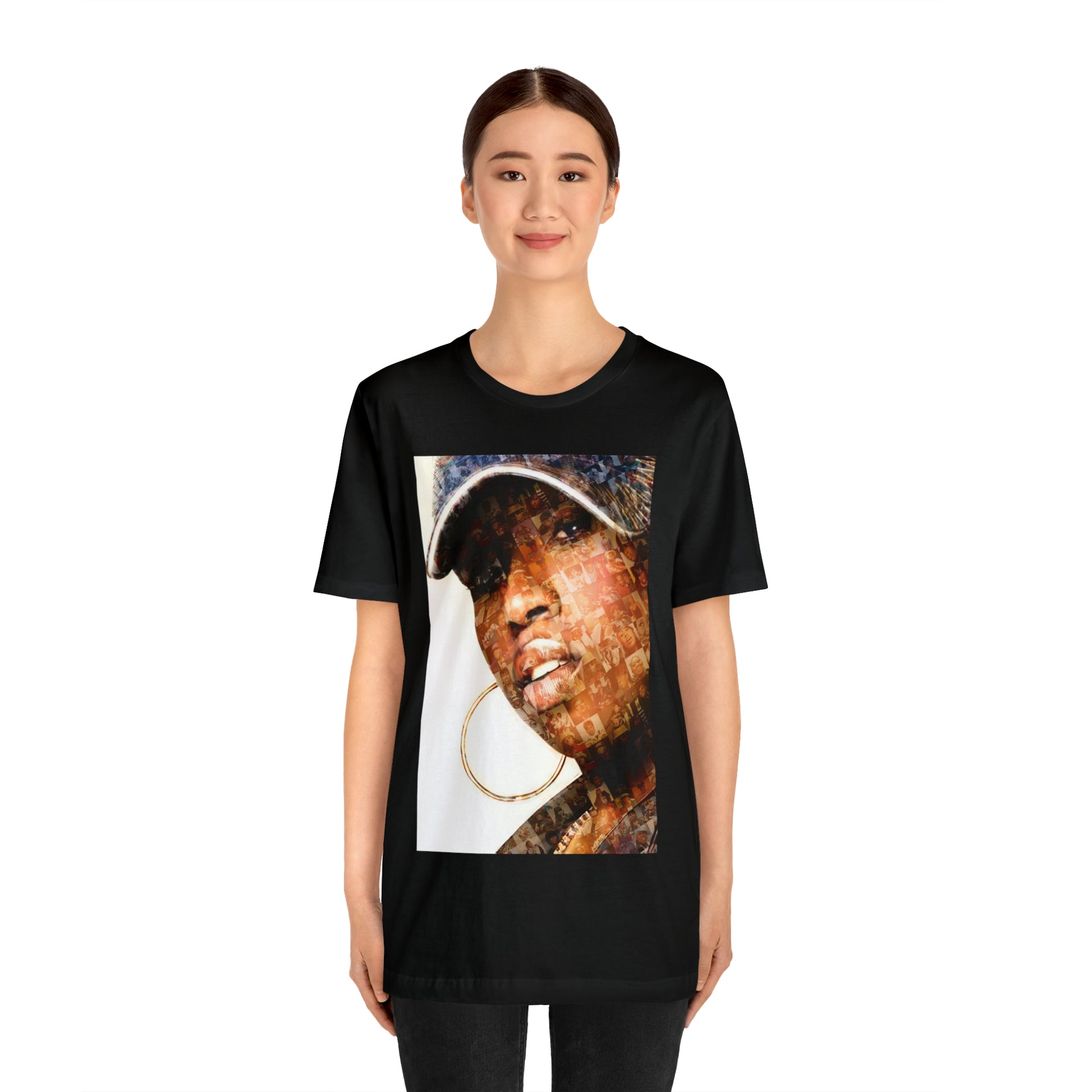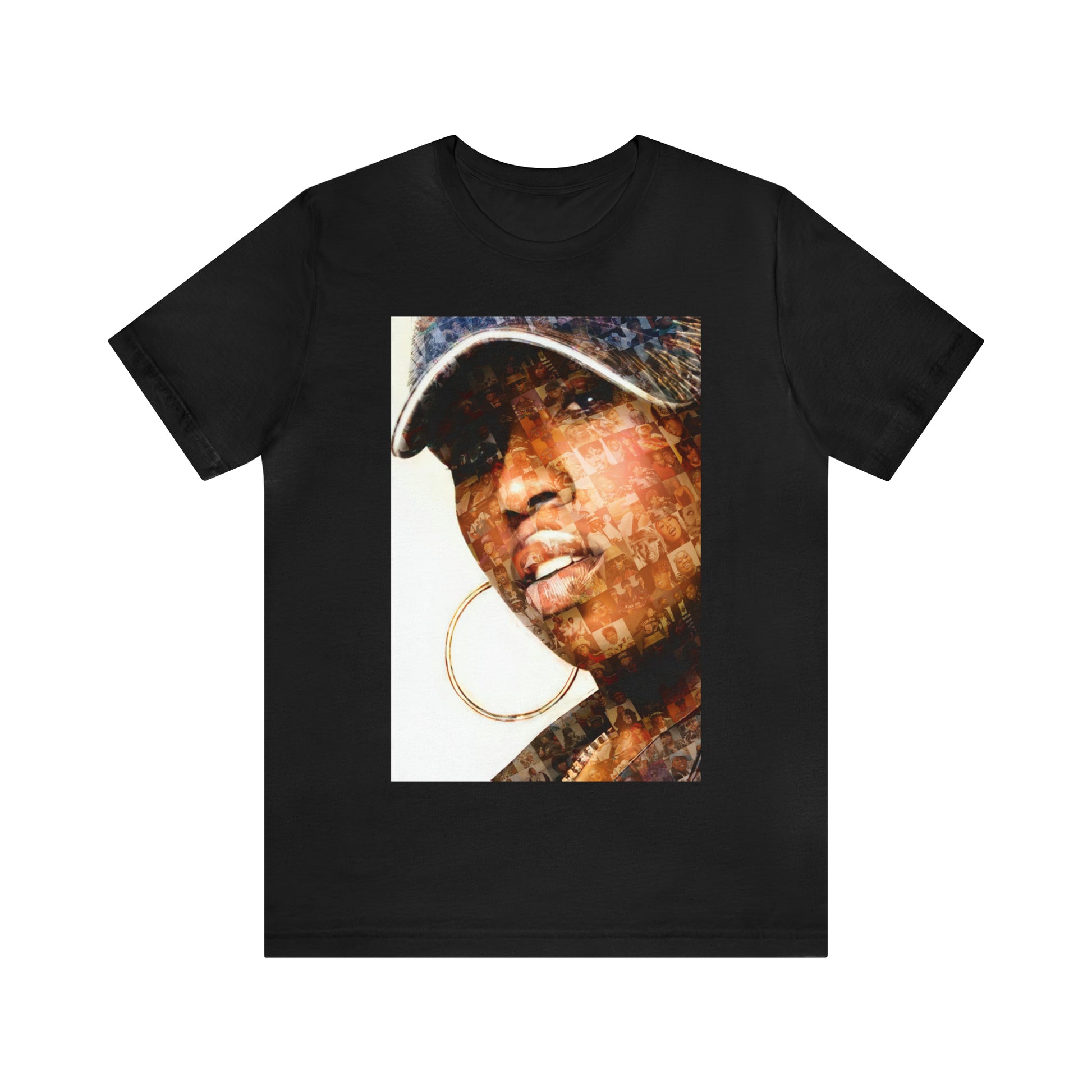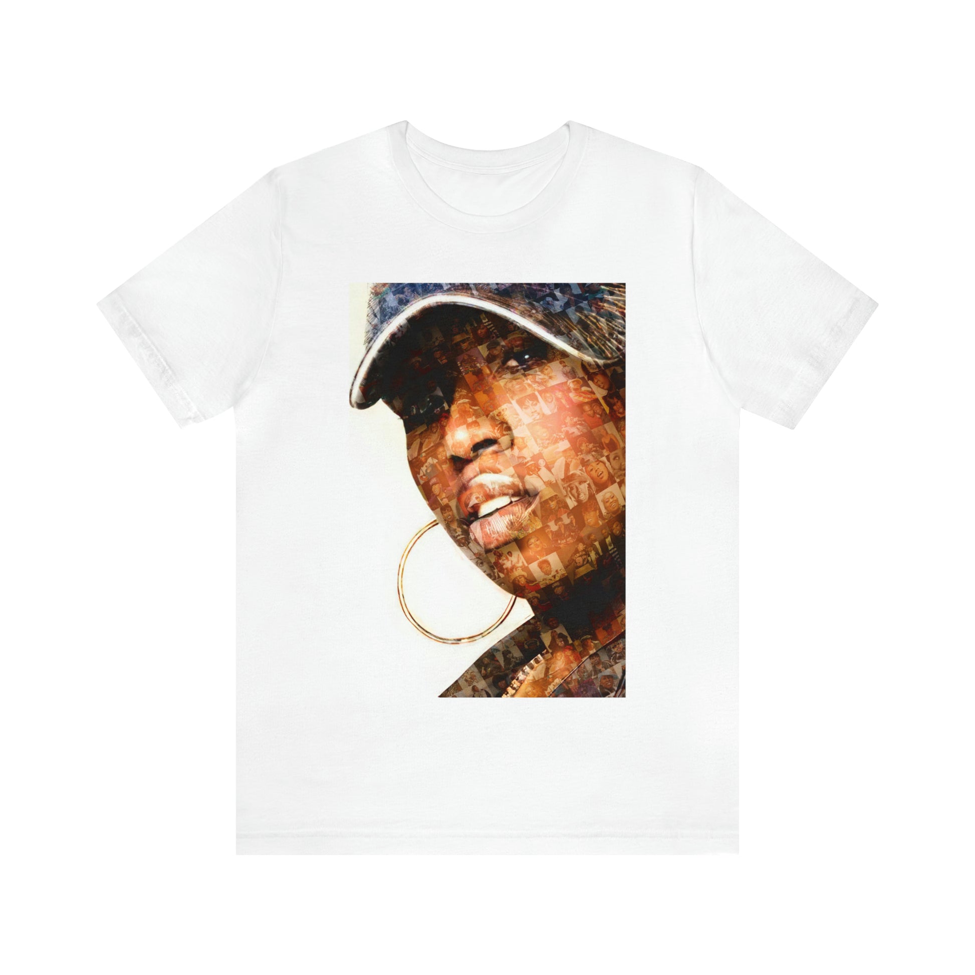 Check out this Missy Elliott original piece. Artist Robert Hansen takes some of Missy Elliott's most exciting pictures and uses them to create an amazing portrait of the rap superstar! This classic unisex jersey short sleeve tee fits like a well-loved favorite. Soft cotton and quality print make users fall in love with it over and over again. These t-shirts have-ribbed knit collars to bolster shaping. The shoulders have taping for better fit over time. Dual side seams hold the garment's shape for longer.