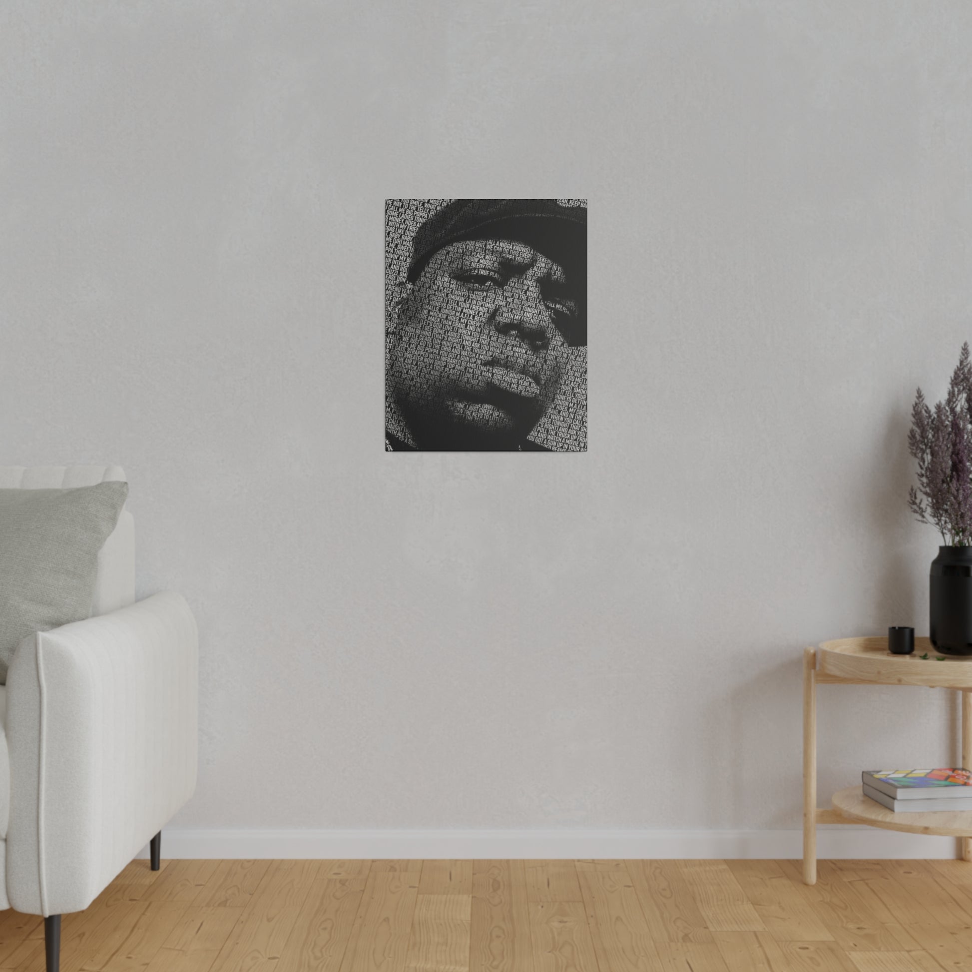 Check out this Notorious B.I.G. original piece. Artist Robert Hansen takes some of Biggies's most exciting lyrics and uses them to create an amazing portrait of the rap superstar! Each matte canvas comes with back hanging already included for convenient placement. The frame is made with profile radial pine that is ethically sourced from renewable forests.