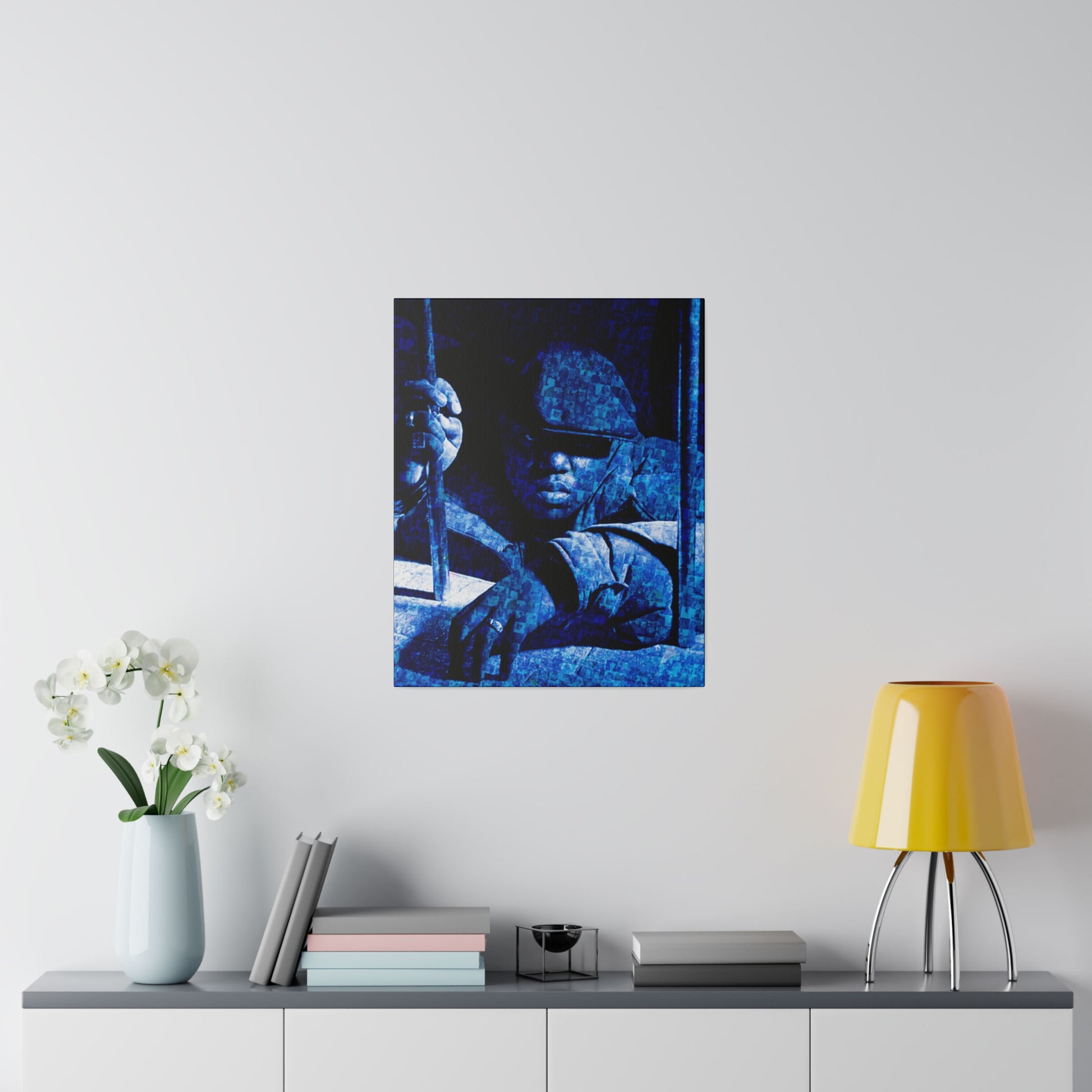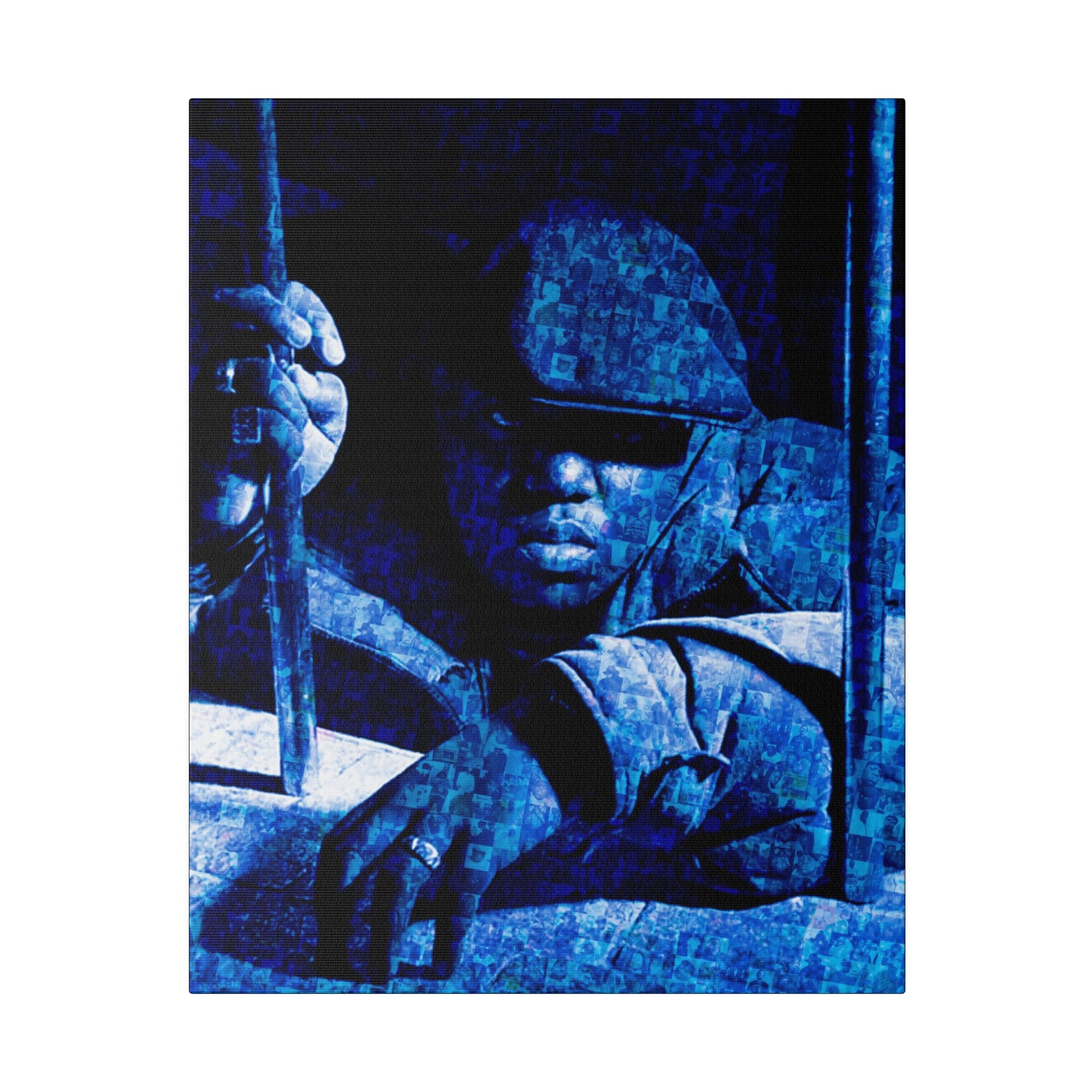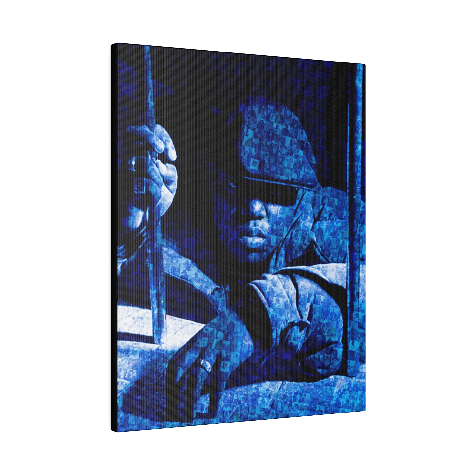 Check out this Notorious B.I.G. original piece. Artist Robert Hansen takes some of Biggies's most exciting pictures and uses them to create an amazing portrait of the rap superstar! Each matte canvas comes with back hanging already included for convenient placement. The frame is made with profile radial pine that is ethically sourced from renewable forests.